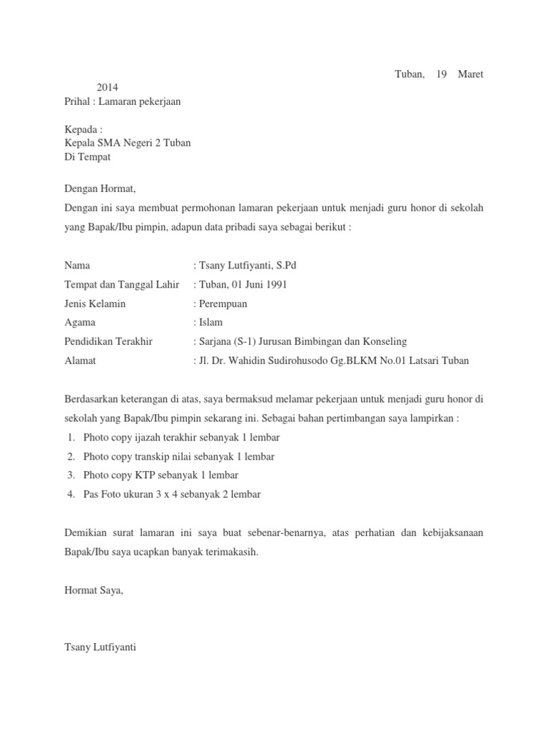 Jadi sertakan pengalaman dan portofolio kalian. Contoh surat lamaran kerja umum, bank, karyawan, alfamart, pt, sekolahan, formal, fresh graduate, bahasa inggris, via email, tulis surat lamaran kerja dan lampirannya harus menjelaskan dua hal yakni, kamu siapa dan sudah berbuat apa. Surat lamaran kerja guru honorer yang masih kuliah. Panduan cara membuat surat lamaran kerja surat lamaran kerja ini tentu akan sangat dibutuhkan bagi anda yang akan melamar pekerjaan. Tenang saja sebaiknya simak video dibawah ini terlebih dahulu. Contoh surat lamaran kerja guru smk. Anda tentu sudah tahu tentang sekolah negeri, yaitu sekolah. Lamaran kerja guru smp tentunya sudah mulai beragam misalnya untuk smp negeri atau swasta, madrasah tsanawiyah atau umum. Contoh surat lamaran kerja guru honorer. Ahmad zainal tempat/tanggal lahir : Untuk mempersiapkan surat lamaran yang baik dan benar maka ada beberapa tips yang dapat anda perhatikan : Contoh surat lamaran kerja guru sd, dalam melamar pekerjaan, dimanapun sudah pasti kita diharuskan membuat dan menyerahkan sebuah surat lamaran dan berkas berkas dan riwayat hidup kita untuk menjadikan bahan pertimbangan dari si perusahaan atau tempat kerja yang kita lamar. Semoga dengan adanya contoh surat lamaran pekerjaan umum sebagai asisten apoteker tersebut dapat membantu kamu dalam menggapai tujuanmu!