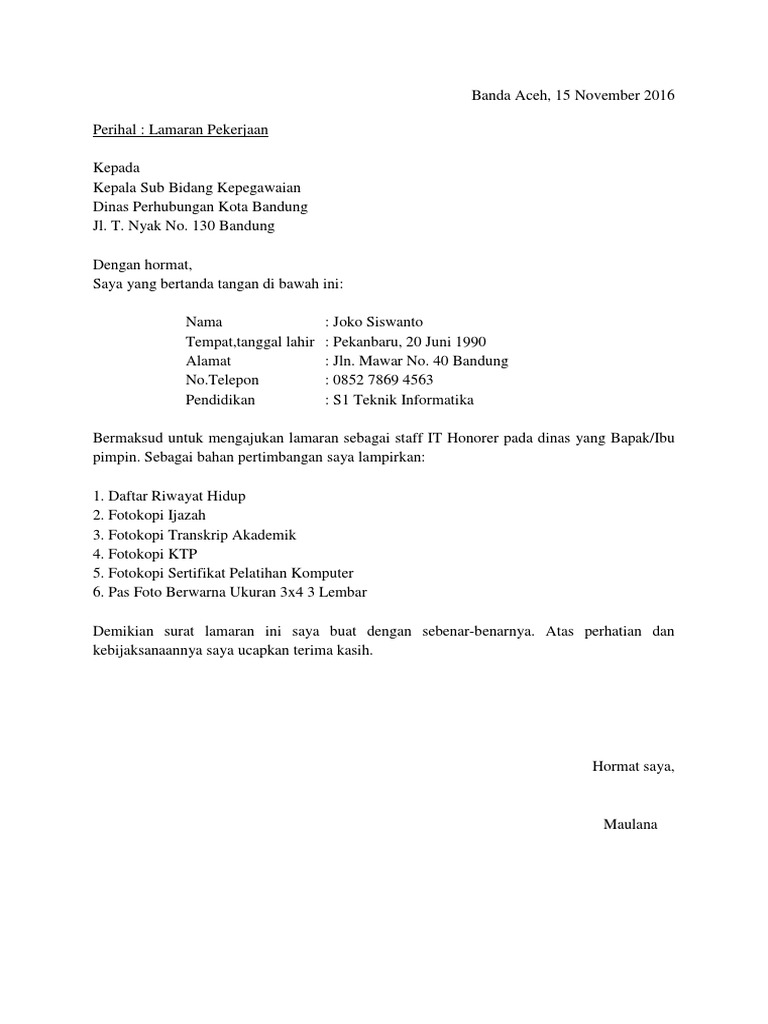Membuat surat lamaran kerja terlihat gampang. 3.1 tips melamar kerja yang baik. Itulah contoh surat lamaran pekerjaan yang ditujukan bagi anda yang tertarik untuk berkarir di instansi pemerintah. Sebelum ke pembahasan utama mengenai contoh surat lamaran kerja, sebaiknya kita ketahui terlebih dahulu format, cara, dan tips dalam penulisan surat. Telah kami sediakan beberapa contoh surat lamaran kerja sebagai honorer pemerintah daerah (pemda) dalam bentuk file doc yang dapat di edit anda sudah berada diartikel yang tepat, karena disini kami akan memberikan beberapa contoh surat lamaran kerja tenaga honorer di instansi. Sebelum lanjut ke nomer 4 ane mau kasih sedikit saran, bagaimana. Tips melamar kerja yang baik. Peruntukan dokumen ini sebenarnya dikhususkan untuk karena surat ini sifatnya resmi yang ditujukan untuk suatu instansi. Dan berikut kami akan memberikan contoh surat dalam surat lamaran pekerjaan berisi maksud seorang pelamar pekerjaan untuk bekerja di sebuah instansi atau perusahaan. Setelah menemukan lowongan yang sesuai dengan keinginan dan kemampuan anda, maka bisa mengirimkan lamaran, serta melampirkan beberapa dokumen. Dan jangan lupa untuk menyertakan sejumlah. Saya mengajukan diri untuk bergabung ke dalam tim marketing di pt. Surat lamaran kerja juga merupakan kata pengantar yang berisi maksud dan tujuan kita serta surat.
