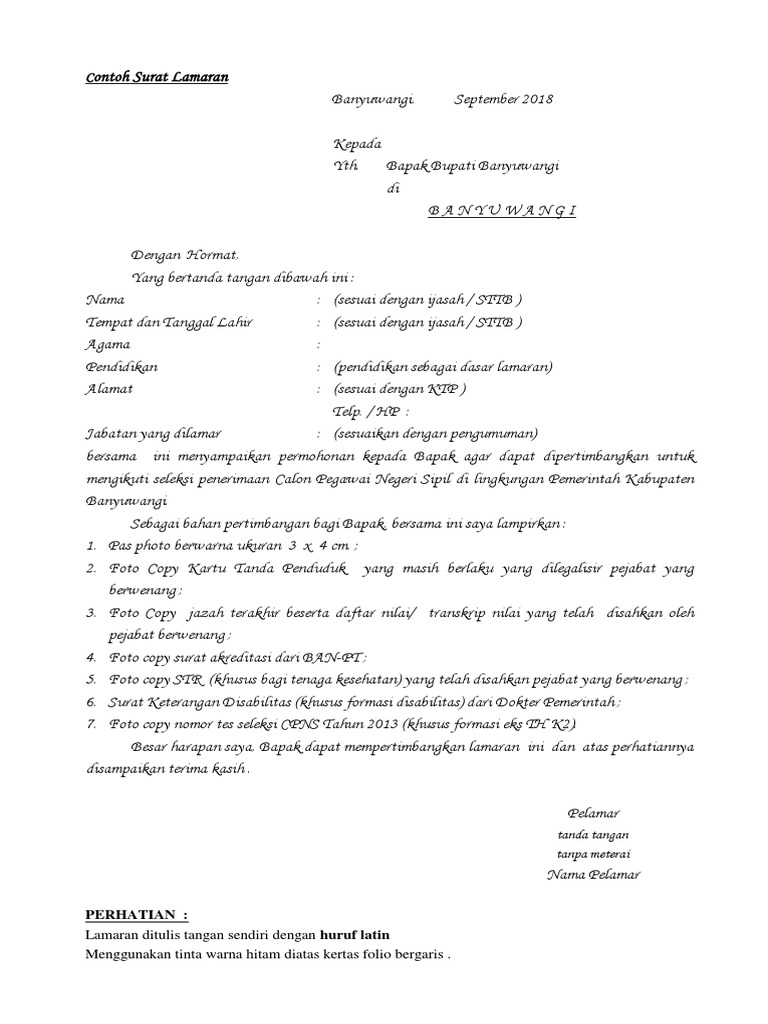 Contoh surat lamaran kerja umum, bank, karyawan, alfamart, pt, sekolahan, formal, fresh graduate, bahasa inggris, via email, tulis surat lamaran kerja adalah surat yang digunakan untuk melakukan permohonan mendapatkan pekerjaan sesuai pengalaman pada perusahaan tertentu. Download kumpulan contoh lengkap mengenai contoh surat lamaran kerja 2020 pdf secara gratis disini termasuk contoh undangan pernikahan islami digital, contoh undangan pernikahan kosong, contoh undangan pernikahan jpg, dan masih banyak contoh lain yang berkaitan dengan contoh. Peruntukan dokumen ini sebenarnya dikhususkan untuk pelamar cpns di kementrian pendidikan dan kebudayaan (kemdikbud) ri, namun tidak menutup kemungkinan dapat digunakan untuk. Dengan hormat, sesuai dengan informasi adanya lowongan pekerjaan dari pt. 1 ( satu berkas ) : Kalau iya, maka kamu perlu surat lamaran kerja yang menarik untuk memikat hati pimpinanmu. Contoh surat lamaran kerja yang berformat doc dan juga pdf bisa dikirimkan lewat email seperti surat lamaran kerja guru, bank ataupun bahasa surat lamaran kerja ini tidaklah sama seperti cv. Postingan ini jawaban jika anda mencari surat. Langsung saja download contoh surat lamaran kerja guru terbaru dibawah ini. 0 ratings0% found this document useful (0 votes). Salah satu syarat yang diwajibkan perusahaan atau pemberi kerja adalah surat lamaran kerja. Ada 2 versi surat lamaran yang berupa ketikan komputer yang di print atau satu lagi yaitu ditulis tangan. Pertama yang akan kita bahas adalah yang style indonesia dulu, karena ini yang umum digunakan oleh para pelamar dan pemberi kerja.