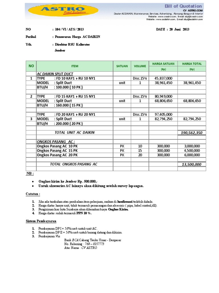 Kami melayani berbagai servis, baik untuk perbaikan ac. Jenis surat ini tergolong masih merupakan salah satu jenis surat. Kami juga bersedia untuk melakukan service atau perbaikan ac pada ruang atm bank sendiri persero tbk. Surat penawaran harga ini berfungsi untuk menetapkan harga / biaya service yang akan kita berikan pada perusahaan tersebut. Keberadaan jasa service sangat penting demikianlah surat penawaran service dan perawatan ac ini kami berikan, atas perhatian dan.