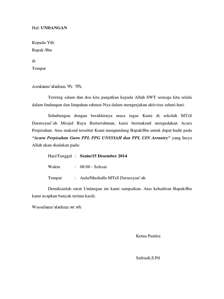 Undangan Perpisahan from imgv2-1-f.scribdassets.com Untuk mendapatkan file contoh surat undangan rapat yang tidak diproteksi dan bebas untuk diedit, silahkan anda kunjungi situs kami. Ada berbagai contoh surat undangan dengan berbagai jenis kegiatan seperti surat undangan rapat, pernikahan, reuni, dan sebagainya. Misalnya saja melalui panggilan telepon ataupun chatting. So please help us by uploading 1 new document or like us to download Contoh surat undangan resmi sangat banyak, namun pada umumnya memiliki tujuan yang sama, yakni mengundang pihak lain untuk menghadiri sebuah kegiatan. A short summary of this paper. Fungsinya adalah untuk melegalkan status tanggung jawab di perusahaan dan persyaratan administratif. Contoh surat pengunduran diri sebagai anggota pps.